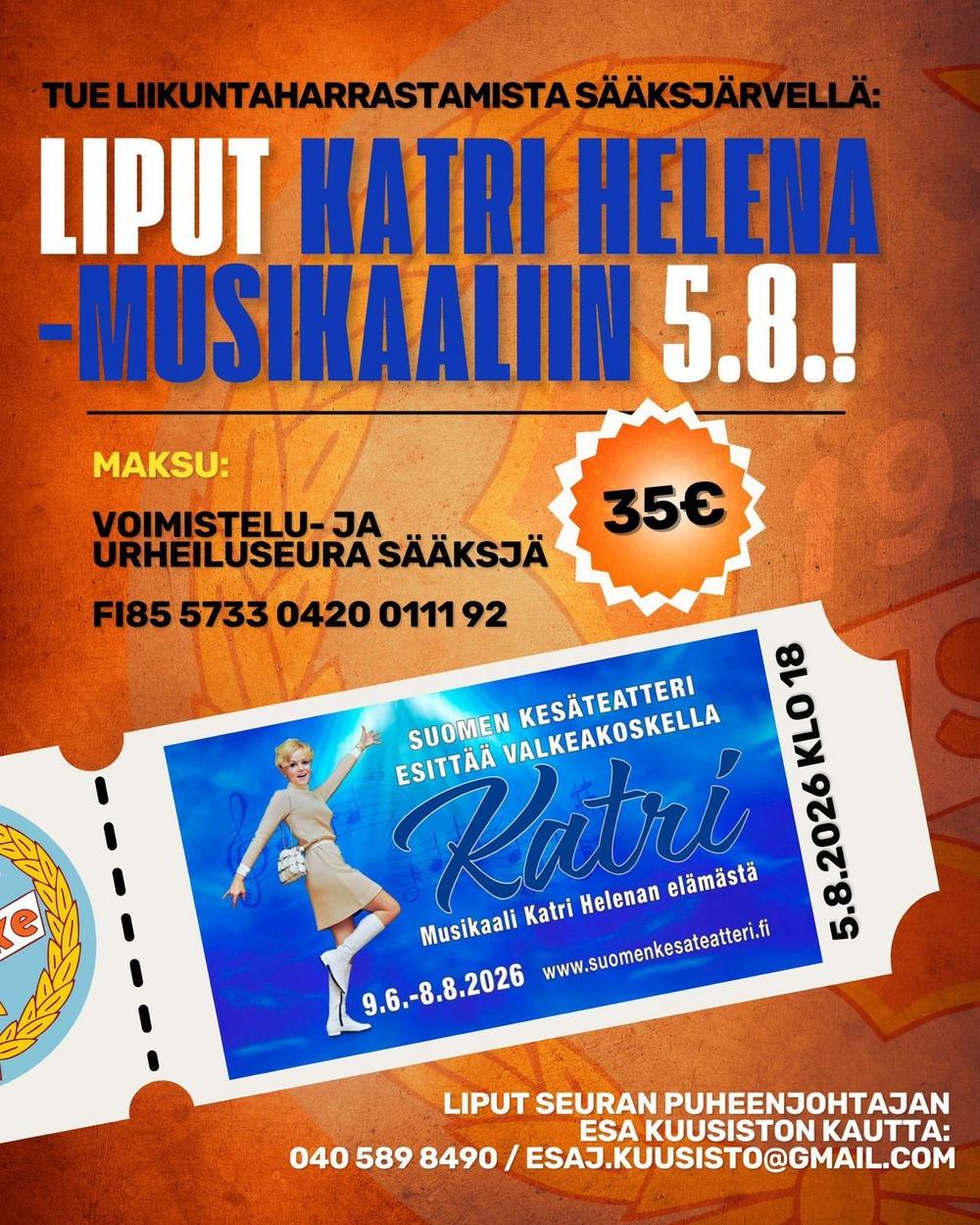 Osta liput Valkeakosken kesäteatteriin 5.8.2026 klo 18:00 ja tue Sääksjärven Loiskeen toimintaa! Ota yhteyttä seuran puheenjohtajaan Esa Kuusistoon 040 589 8490 / esaj.kuusisto@gmail.com. Lippuja…