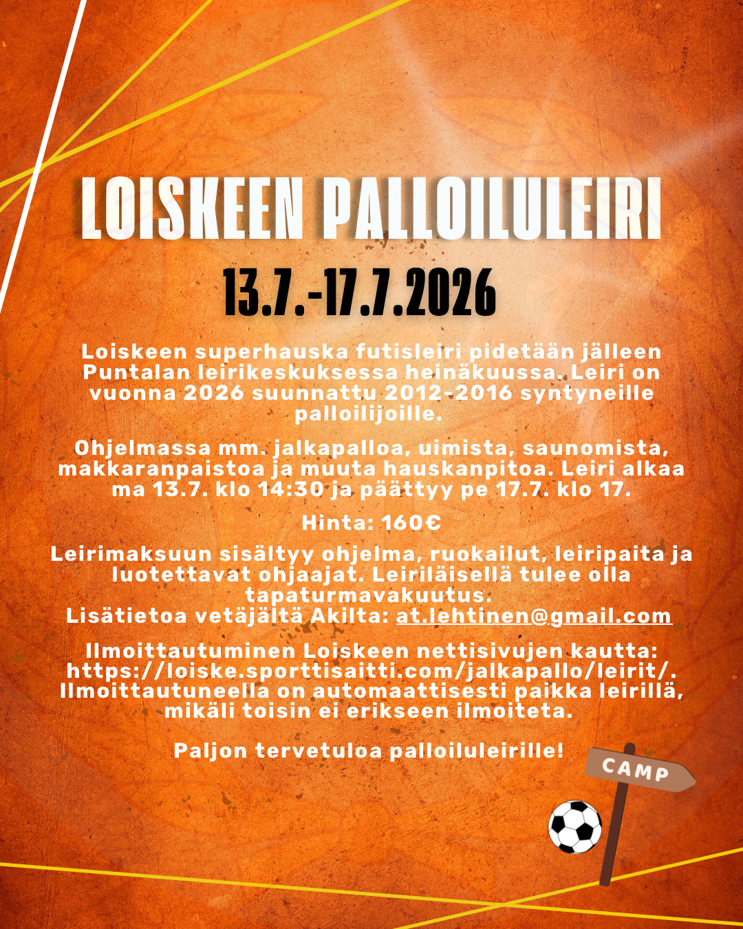 Loiskeen suosittu jalkapalloleiri järjestetään Puntalan leirikeskuksessa ma 13. - pe 17. heinäkuuta 2026! Leiri on suunnattu vuosina 2012-2016-syntyneille lapsille. Ilmoittautuminen on nyt auki 40 ensimmäiselle! Lue lisää ja ilmoittaudu täällä.